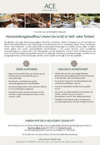- Unterstützung bei der Vermarktung und des Vertriebs unserer Eventformate sowie unserer Location „ACE“