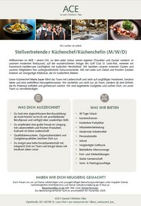 Unser Küchenchef Mario Sauer führt das Team mit Leidenschaft und setzt auf sorgfältiges Handwerk, kreative Ideen und eine weltoffene Herangehensweise. Wir verstehen uns nicht nur als Team, sondern als eine Einheit, die ihr Potential entfaltet und gemeinsam wächst. Wir sind begeisterte Gastgeber und suchen Dich, um unser Team zu vervollständigen.
